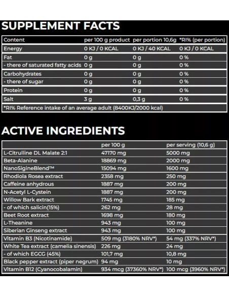 A L-Citrulline DL-Malate, Beta-Alanine és NanoSigineBlend™ kombinációja segít növelni a nitrogén-oxid szintet, javítja a vérkeringést és fokozza a fizikai teljesítményt. A hozzáadott Rhodiola Rosea, Ginzeng és L-Theanine segít csökkenteni a mentális fáradtságot, míg a 200 mg koffein extra lökést ad az intenzív edzésekhez.