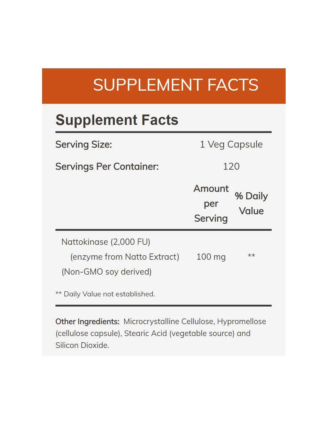 A NOW® Nattokinase nem GMO-szójából származik, és 100 FU adagonként 2000 FU-t (fibrinolitikus egységet) tartalmaz.