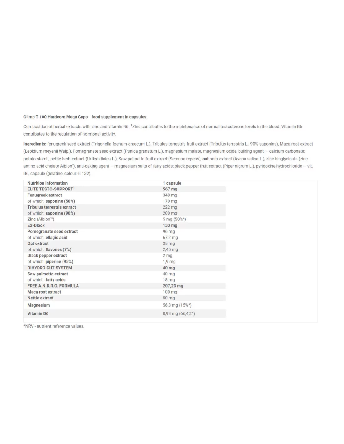 Kíváncsi vagy, hogyan lehet fenntartani a tesztoszteronszintet a vérben? Pontosan erre a célra az Olimp Laboratories gyógyszergyár szakemberei innovatív technológiát alkalmazva megalkották a T-100 Hardcore Mega Caps by Olimp Sport Nutrition-t. A készítmény kiváló minőségű összetevők, többek között növényi kivonatok és cink kombinációja, magnéziummal és B6-vitaminnal dúsítva.