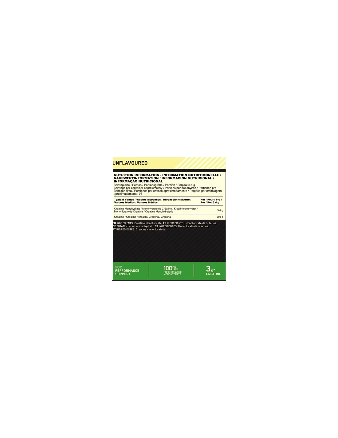 Az ON Creatine minden egyes adagja full 5 gramm (5000 mg) 99.9%-os tisztaságú Creapure kreatin-monohidrátot tartalmaz, mely a legtisztább és leghatékonyabb kreatin-monogidrát forma. A szabadalommal védett előállítási technológiának köszönhetően a Creapure kreatin-monohidrát egy színtelen, szagtalan, vízben és gyümölcslében tökéletesen oldódó és maximálisan hasznosuló formula, így a kreatin kiegészítés legmagasabb szintjét képviseli!