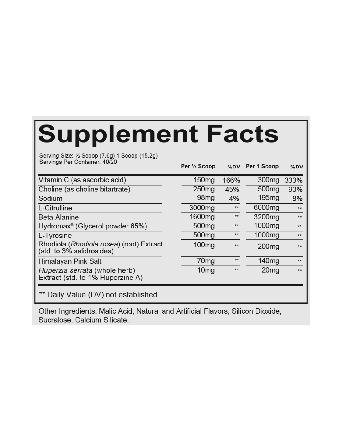 A termék egy “professzionális minőségű” összetételre épül, amely 6 g L-citrullint, 3,2 g béta-alanint és 1 g HydroMax®-ot kombinál az izomvolumen és állóképesség támogatására – mindezt koffein és egyéb stimulánsok nélkül.